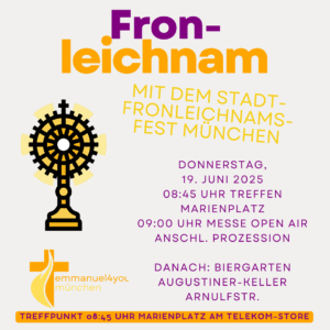 Wir feiern Fronleichnam und schließen uns der Stadtprozession an! Treffpunkt 8.45 Uhr Marienplatz, vor dem Telekom Shop gegenüber vom Rathaus. Haltet nach der Emmanuel-Flagge Ausschau!