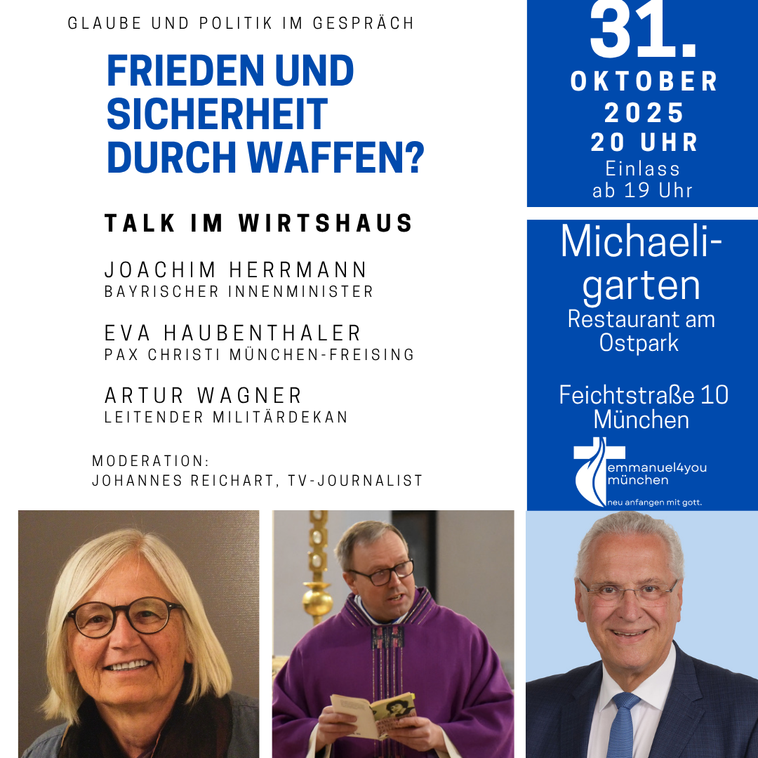 Der Talk wird veranstaltet von “emmanuel4you”. Dieses innovative Projekt ist getragen von der Erzdiözese München und Freising in Zusammenarbeit mit der katholischen Gemeinschaft Emmanuel. Es möchte auf kreative Weise den christlichen Glauben neu ins Gespräch bringen zu aktuellen Themen unserer Gesellschaft.